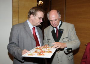 NÖ Landshautmann Pröll beim Verkosten der belegten pikannten Oblaten